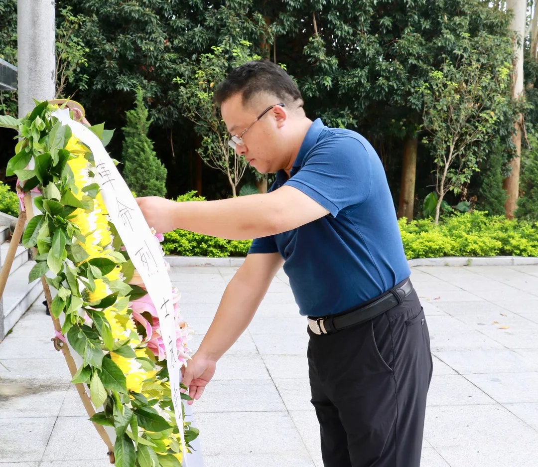在革命烈士纪念碑前,全体党员干部整齐列队,神情肃穆,向革命先烈敬献花圈,鞠躬默哀。在鲜红党旗下,全体党员干部佩戴党徽,举起右手、握紧拳头,在南粤基金党组织书记、董事长林涛带领下,庄严重温入党誓词,以此表达对革命先烈的深切哀思和崇高敬意。
